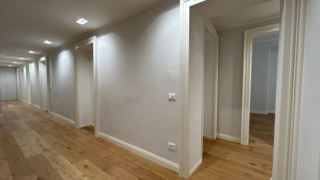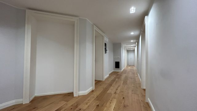 L'ingresso spazioso disimpegna le due zone; reparto notte costituito da 4 camere, cabina armadi e servizio. Luminosa zona living con ampia cucina abitabile balcone e doppio servizio. Le finiture sono state completamente riviste ed adeguate a raggiungere un ottimale efficientamento energetico con riscaldamento a pavimento, infissi triplo camera, controsoffitti, canalizzazioni. A corredo troviamo una cantina di pertinenza al piano seminterrato, posto auto per carico e scarico.