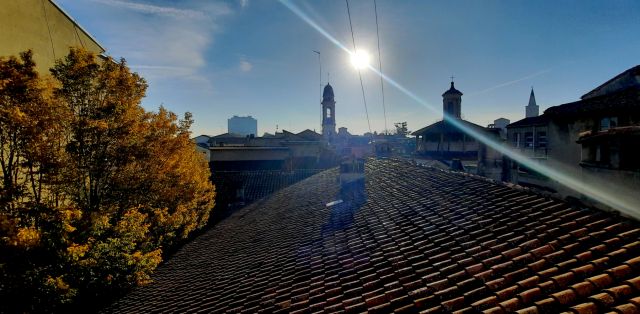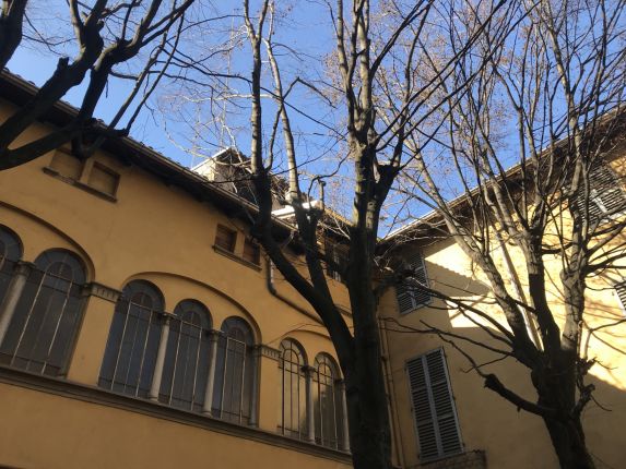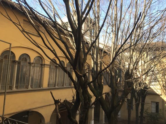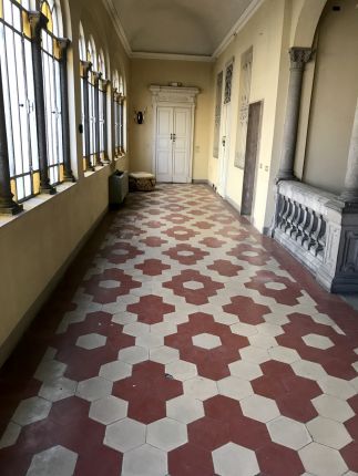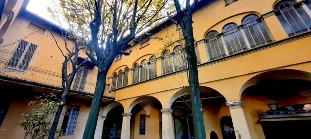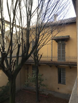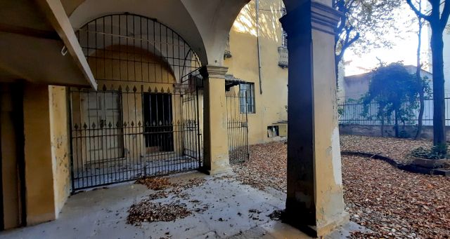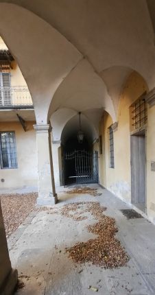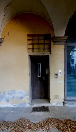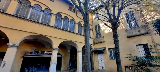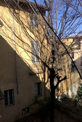 Palazzo d'angolo nel centro storico, tra via Angelo Genocchi e via Gregorio X, con doppio ingresso, area cortilizia alberata e piccolo giardino. Un ampio colonnato al piano terra sostiene l'appartamento nobiliare del 1° piano.